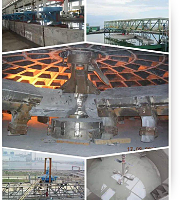 沉淀池刮泥機(jī)我公司根據(jù)現(xiàn)場的工況要求設(shè)計了在扭矩過大時攪拌軸和攪拌耙壁自動提升裝置,當(dāng)扭矩下降后再自動下降刮泥的功能以防止不穩(wěn)定的工況下攪拌軸和刮泥耙壁的損壞。主要有扭矩和功能電氣控制系統(tǒng)、傳動減速機(jī)系統(tǒng)、回轉(zhuǎn)支撐系統(tǒng)、自動提升系統(tǒng)、攪拌耙壁系統(tǒng)等組成。轉(zhuǎn)速從0.07-0.2rpm,池體直徑?3-25m,扭矩3000-50000N.m,可以長期無后顧之憂的使用。